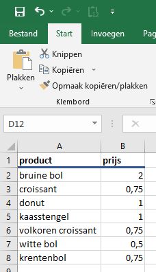 Stel we hebben product data van een bakker in kolom A & B van je eerste werkblad staan.