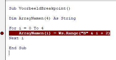 De waarde toekenning ‘hier’ aan de variabele ‘Pauzeer’ is in dit geval niet relevant. Deze mag je vervangen door een actie naar keuze. Het punt is dat je op deze regel nu een breakpoint kunt plaatsen die je code op het juiste moment binnen je loop pauzeert.
