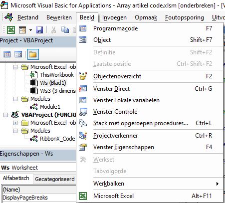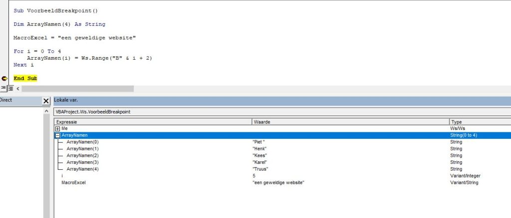 Op het moment dat je een breakpoint hebt geplaatst in je macro zal je run op dat moment pauzeren. Je kunt op dat moment de waardes van je gebruikte variabelen uitlezen in het venster Lokale variabelen. Mocht dit venster niet zichtbaar zijn dan kun je deze onder het menu ‘Beeld’ selecteren.
