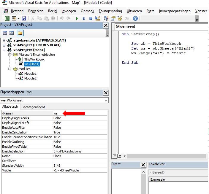 Zojuist heb je gezien hoe je in een VBA script een werkblad een naam kunt geven die je verder kunt gebruiken in je code. Dit is echter ook iets dat je ook buiten je script in de visual basic editor kunt uitvoeren. Door bij eigenschappen van je Werkblad de ‘name’ aan te passen krijg je precies hetzelfde resultaat als wanneer je een ‘set’ uitvoert.